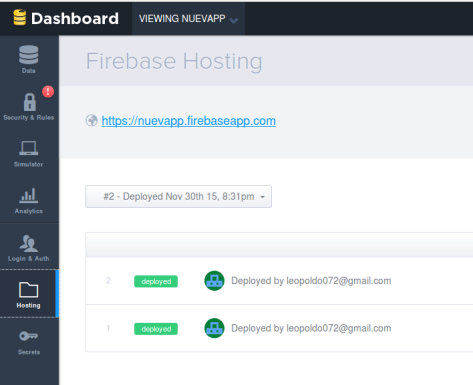 Desde la consola podemos iniciar, darle nombre a la aplicación y hospedarla directamente. Actualizamos el escritorio de Firebase y ya tenemos la aplicación creada. En Hosting pinchamos en el enlace.