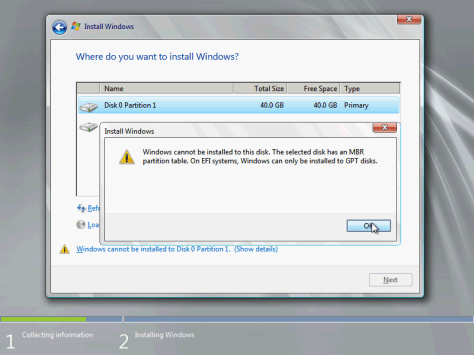 Windows no puede instalarse en este disco. El disco tiene una tabla de partición MBR y en sistemas EFI solo puede instalarse en discos GPT.