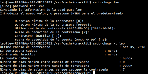 Con el comando chage establecemos los siguientes criterios para nuestra contraseña: