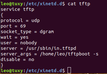 Dentro de xinet.d crear un archivo, por ejemplo tftp con la siguiente configuración.
