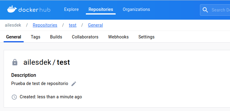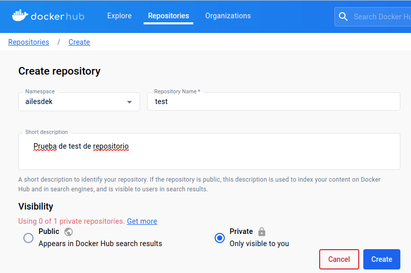 Vamos a crear un repositorio en nuestro Docker Hub, con la cuenta gratuita podemos crear un repositorio privado. Para crear nuestro repositorio privado pinchamos en Repositories y en Create repository
