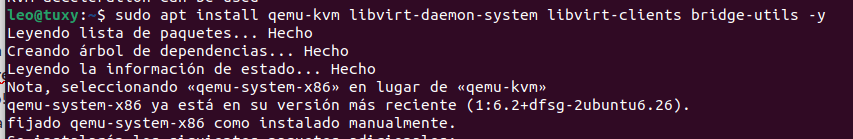 sudo apt install qemu-kvm libvirt-daemon-system libvirt-clients bridge-utils -y