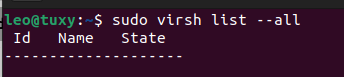 Confirmar que la instalación de KVM se ha realizado bien con el comando virsh. EL comando lista todas las máquina virtuales activas e inactivas del sistema.