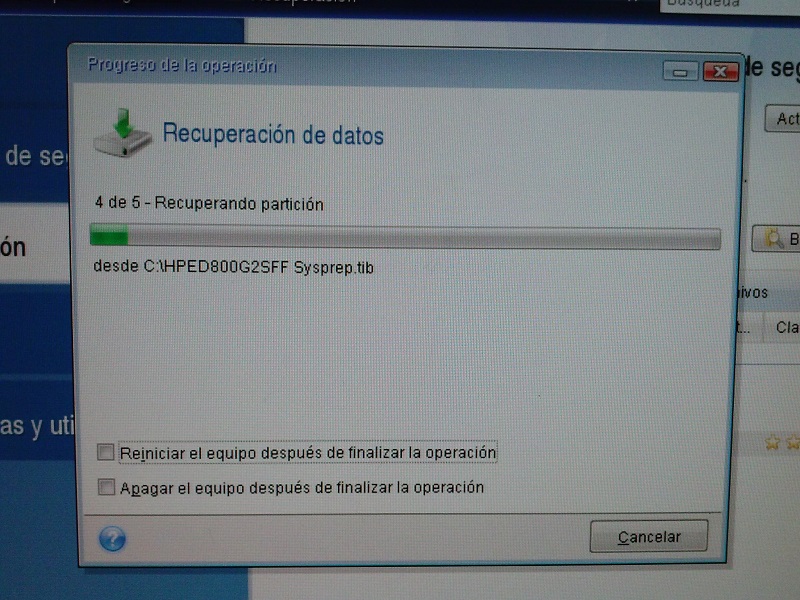 Recuperar imágen con Acronis True image 2015 7 julio, 2020 800 × 600 Recuperar imágen con Acronis True image 2015 Empieza el proceso de recuperación. Abajo podemos programar Acronis para apagar o reiniciar el equipo cuando termine de restaurar