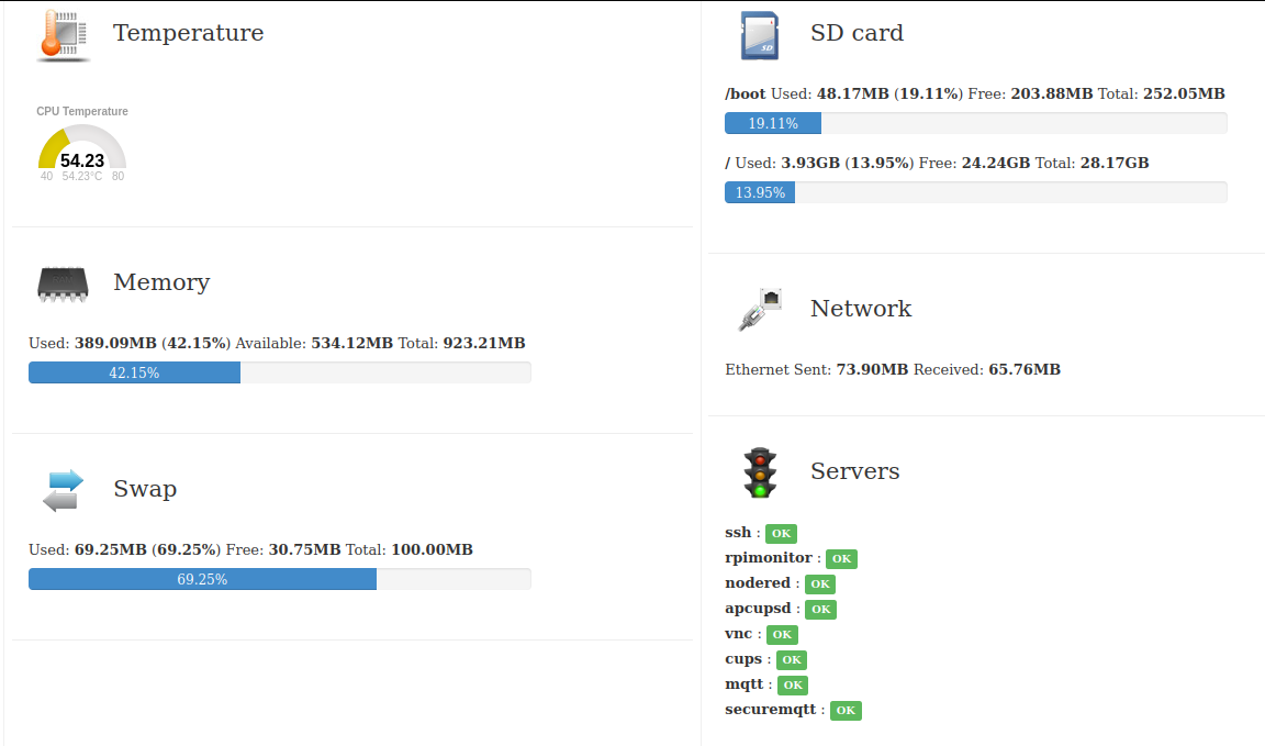 RPi-Monitor es una aplicación para monitorizar tu Raspberry Pi. Puedes ver el consumo de la CPU, temperatura, Uptime, memoria, espacio en disco, red, servicios…