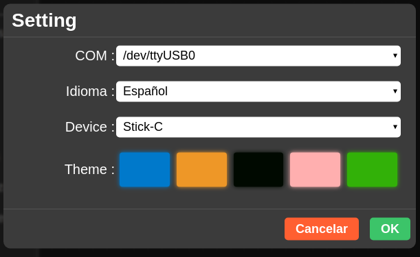 m5flow_setting 2 julio, 2020 611 × 375 m5flow_setting Setting de m5flow Configuración de puerto COM, idioma y dispositivo.