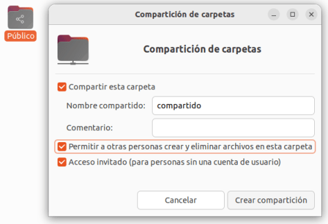 Una vez instalado el servicio creamos la compartición dándole un nombre a la carpeta compartida, y seleccionando ‘Permitir a otras personas crear y eliminar archivos en esta carpeta’, o ‘Acceso invitado’. En teoría si seleccionas la opción de Acceso invitado’ no debería pedir contraseña cuando te conectas. Yo he seleccionado las dos opciones y cuando he intentado conectarme desde Windows me ha pedido usuario y contraseña.
