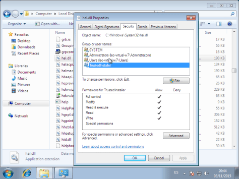 Para gestionar permisos de archivos situarnos en el archivo y pinchar en botón derecho, Propiedades. En Seguridad vemos los usuarios o grupos que tienen permisos sobre el archivo, el usuario TrustedInstaller es el instalador confiable según Windows.