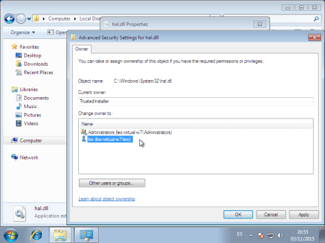 Para editar permisos hay que ser propietario del archivo, en la opción Advanced/Avanzado ir a Owner/Propietario, y cambiar el propietario a nuestro usuario. En editar seleccionar nuestro usuario y pulsar OK. Volver a la pestaña Seguridad/Security, para cambiar permisos pinchar en editar, seleccionar el usuario y otorgar o restringir permisos con Allow/permitir o Deny/denegar.